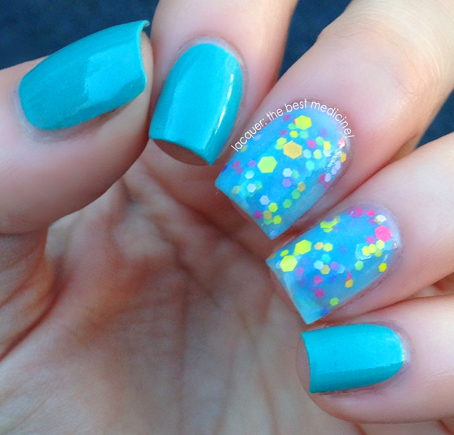 Kayla: a teal jelly full of fine and small holo silver glitter. The charm can also be purchased separately from Lavish Polish.